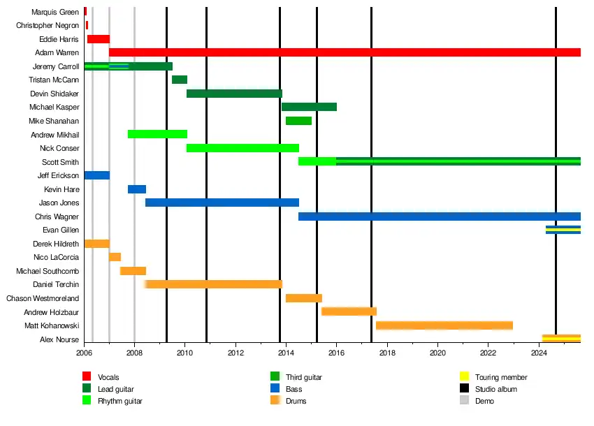 Following the departure of lead guitarist Jeremy Carroll in 2009, the band no longer had any of its original members. Vocalist Adam Warren was the longest tenured member of the band, having been with Oceano from 2007 until 2025.