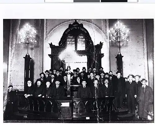 Other histories record that Adas Israel was formed in the 1890s by members of the Moses Montefiore congregation, an earlier Orthodox congregation composed of Lithuanian Jews. By the turn of the 20th century, there were close to 1,500 Jews living in Duluth, most of who were Russian or Eastern European. The men in the picture were observing Simchas Torah, the holiday marking the end of the weekly cycle of Torah readings. (1914)[10]...The men are assembled on the bimah (the stage or platform in front of the Ark) containing the Torah scrolls of Adas -- literally, "'congregation' Israel". (1919).[11]