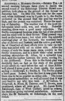 Addiewell at least reached the third round of the Edinburgh Shield, having to beat Mossend Swifts twice after a protest,[10] but went down 8–0 to St Bernards in the third.