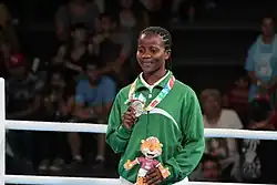 Adijat Gbadamosi is a bantamweight/super bantamweight boxer and silver medalist at the 2018 Buenos Aires Youth Olympic.[1] She is the first Nigerian female boxer to win an African boxing title after a TKO victory over Zimbabwean Patience Mastara during the 2023 Africa Super Bantamweight female title fight.[2][3][4]
