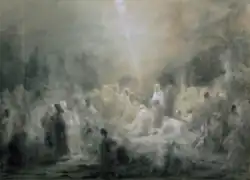 The scene is framed by the crowd, the Romantic vague suggestion of ruins and a misty pale sky, with a dramatic horizon painted as an open 'V' shape,[3] guiding the view towards the focal point of the composition: Jesus on Mary's arms.