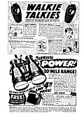Comic book advertisements are a common feature in American comic books mainly from the 1940s onwards. As these advertisements were directed at young people, many made sensational claims,[1] and sold the products for a few dollars or less, to be sent to a post office box. Products offered included novelty items, toys, and self-improvement courses such as drawing and body building.