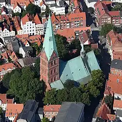 The St.-Aegidien-Kirche or Aegidienkirche is a church building in the north German city of Lübeck, dedicated to saint Giles. It is the smallest and easternmost church in the city centre. It is first mentioned as dedicated to St Giles in 1227; this is unusual for a north German and may link it to an earlier 1172–1182 wooden church built under bishop Henry I, formerly the abbot of the abbey dedicated to the same saint in Braunschweig. The church's coat of arms includes a "T", short for "Tilgenkark", the Low German form of the church's name, and "St Tilgen" or "St. Illigen", the Low German forms of the saint's name.[1]