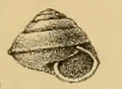 (Description originally in Latin) The shell assumes an obtusely conical shape, featuring a prominent keel and a distinct umbilicus. The shell exhibits a brownish hue. Delicate growth lines and additional spirals, particularly evident above and below the midpoint of the body whorl, are intricately carved. The spirals themselves are convex, with a gentle, rounded contour. The shell contains approximately six whorls, from which small convexities gradually emerge, culminating in a keeled body whorl where the area above and below the keel is concavely impressed. Below the convexities, the whorl barely descends. The depth of the umbilicus measures about 1/5 diameter. The aperture appears oblique and sublunate, albeit small in size. The peristome presents a pale hue and is notably thickened, with minimal expansion and edges that are slightly flattened, connected by a thin callus. [2]