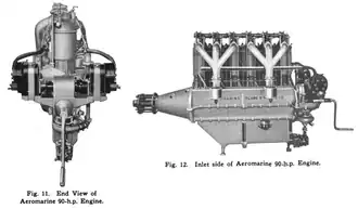 The Aeromarine 90 hp was the first aircraft motor built by the Aeromarine Plane and Motor Company in 1914. In that year, Aeromarine had acquired the patents and manufacturing rights to the aircraft and engines of the Boland brothers. Although the Boland brothers didn't make a 6-cylinder engine, their V-8's all used the unusual concentric valve that is used in this engine. In spite of its model name, this engine only produced 85 hp (63 kW) at 1,400 rpm [1][2][3]