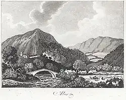 Sketch showing a bridge over the Afon Aber, mountains and cottages