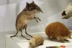 | Taxidermied animals at the Cambridge University Museum of Zoology, England. On the left four-toed elephant shrew (Petrodromus tetradactylus), in the middle Cape golden mole (Chrysochloris asiatica) and on the right greater hedgehog tenrec (Setifer setosus). | |