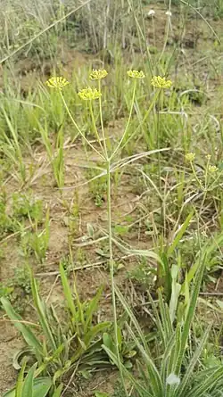 Afrosciadium magalismontanum is a member of the carrot family, Apiaceae. It is a perennial tuberous herb native to subtropical regions in eastern South Africa (Free State, KwaZulu-Natal, and Northern Provinces) and Eswatini.[2][1] It has a tall, narrow stem which divides into multiple evenly-spaced branches near the top, with each branch sporting a cluster of small yellow flowers at its end.