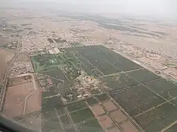 The gardens cover 340 hectares (3.4 km2; 1.3 sq mi) and extend for some 3 kilometres (1.9 mi), surrounded by a 9-kilometre (5.6 mi) long wall.[6] Its location to the south of the city, on a gentle uphill slope leading to the mountains, allowed it to take advantage of the waters coming directly into the city as well as to help protect the water supply of the city by enclosing them within the Agdal's walls.[3] The otherwise flat landscape allowed for easy planting and a regular layout of plots.[8]