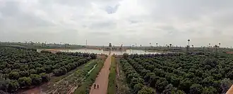Royal Moroccan gardens like the Agdal were designed with a primarily productive agricultural purpose.[8] While there have not been many comprehensive archeological investigations of the Agdal, historical texts provide some information about what was planted here and in other gardens like the Menara. They indicate from its beginning the Agdal was planted with similar types of trees and crops, mostly fruit and olive trees.[8] It was around the time of Almohads that the lemon tree and orange tree first arrived in Morocco from Asia. Vines were also planted and wine was historically consumed at some royal festivities despite its taboo, although the production of wine in the region was concentrated further south along the Neffis River.[3] Over the following centuries various crops are reported to have been grown in the gardens. In addition to olives (the most common crop), lemons, oranges, and vines, other crops included: pomegranate, elderberry, myrtle, roses, jasmine, apricot, and peaches. A census of the gardens in 1916, during the French colonial administration, counted 29,227 olive trees, 9851 orange trees, and 11,717 other fruit trees including pomegranate trees, for a total of 50,795 trees.[8][3] This count is essentially representative of the current gardens. Crops and trees are planted in different areas according to their water needs.[8]