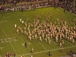 During a game, the Yell Leaders signal the crowd to start a yell by flashing pass backs.[6] Once the signal is passed throughout the crowd, the Yell Leaders give the signal for the crowd to "hump it," or lean forward with hands just above their knees, and the yell begins. The theory behind "humpin' it" is that it aligns the back, neck and throat in the proper position to maximize the noise.[8] They also use pass backs to signal when to sing the various school songs, in much the same way as cheerleaders lead songs at other schools.[8]