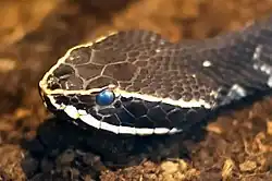 Agkistrodon bilineatus showing the large symmetrical platelike scales on the crown of the head that are characteristic of all species in the genus. The hazy blue eyes are typical of snakes that will soon shed their skin.