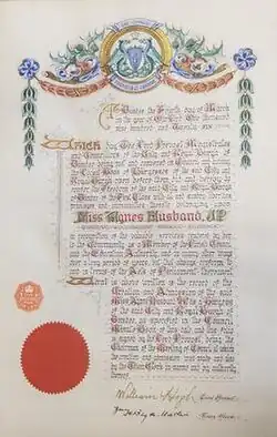 Husband's Burgess ticket was on display in the City Archives for the centenary of women's suffrage,[20] and it says it was "in recognition of the valuable services rendered by her to the Community as a Member of the Parish Council and the Education Authority and in many other ways over a long period of years".