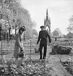 Food rationing was introduced at the start of 1940. It did not completely end until July 1954. The government tried to encourage people to grow their own food in victory gardens, and householders were encouraged to keep rabbits and chickens for the table. There were 1.5 million allotments by 1943. Potatoes became "the food of the war".[58] Because so many men had been conscripted into the army, women were drafted in to work the land; they were called the Women's Land Army, or less formally, "land girls".[59]