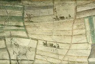 At the time of the parliamentary enclosures, most manors had seen consolidation of tenant farms into large landholdings. Larger landholders already held the bulk of the land.[31] Although they 'held' land, they did not legally own it in today's sense. They also had to respect the open field system rights, when demanded, even when in practice the rights were not widely in use. Each large landholding would consist of scattered patches, not consolidated farms. In many cases enclosures were largely an exchange and consolidation of land, and exchange not otherwise possible under the legal system. Enclosure under the scheme of the Inclosure Act 1773[32] permitted the fencing and regulation of arable land if three quarters of the owners in number and value of the land approved.[33] Regulations and allotments made were valid for six years.[34] The lord of the manor and three quarters of the commoners acting together were empowered to lease one twelfth of the land for the improvement of the remainder.[35]