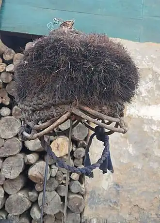 The frame of the hat is fine cane usually in red colour with red goats' hair and hornbill feathers on top frequently with a chain of tigers' claws that hangs around the chin.[3] Some are decorated with double transparent flat horns on both sides.[4] These are made from mithan's horn.[5]