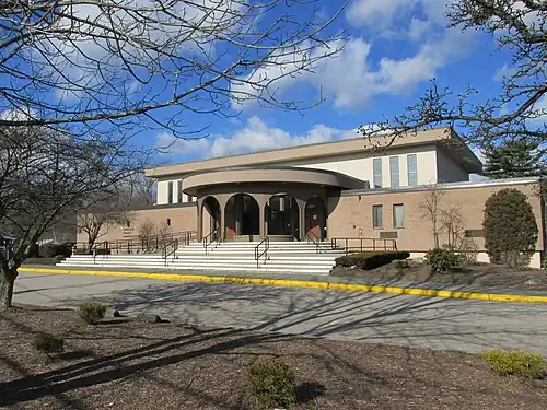 In 1954, Ahavath Achim opened its religious school.[2] In need of a larger synagogue building, it purchased and moved into the former Congregational Church at 30 Pearl Street in 1958.[1][2] As Stoughton's Jewish population grew, membership increased to 72 families, and land was purchased in three stages for a new synagogue. The present building at 1179 Central Street was dedicated in 1970. Further growth led to a significant renovation and expansion of the synagogue building, which was completed in 1987.[2]