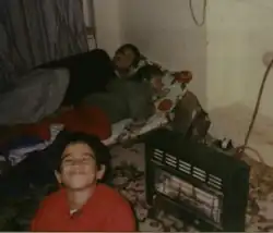 Maha (Abdulkareem in arms), Omar, Zaynab, Abdurahman (facing camera) and Maryam (foreground) in an Islamabad hotelroom while Ahmed was in prison.