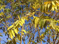 It is sometimes called Chinese sumac,[34] however this name is also frequently applied to the sumac species Rhus chinensis.[35] Similarly, varnish tree is rarely listed as one of its alternate names,[36] but this name is more often applied to other species such as Toxicodendron vernicifluum and Aleurites moluccana.[37][38] This is also the case with copal tree,[6] which is used as a common name for the new world Hymenaea courbaril and Vateria indica from India.[39][40] The strong odor of the tree is a likely inspiration for the name stinking sumac,[41] though again a true sumac, Rhus aromatica, is also known by this name.[42] Lastly the alternate name paradise tree is used for it and also for Simarouba glauca.[10][43]
