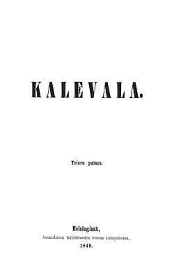 To commemorate the semicentennial of the Kalevala's first publication, the Finnish Literature Society—under the leadership of its chairman, the Finnish senator G. Z. Yrjö-Koskinen—organized a festival on 28 February 1885.[6] The highlight was the premiere of a new Kalevala-themed composition by Finland's then-leading composer: Robert Kajanus's Aino, a symphonic poem (Swedish: symfonisk dikt; Finnish: sinfooninen runoelma) for male chorus and orchestra. Kajanus conducted the Helsinki Orchestral Society (which he had founded in 1882)[7] and an unnamed (likely amateur) choir at the Ceremonial Hall of the Imperial Alexander's University of Finland.[6][8] For Helsingfors Dagblad, the music critic Karl Wasenius (pen name 'Bis') wrote a favorable—if largely descriptive—review, complimenting the piece as "captivating and beautiful... gripping and elevated all the way to the final chord".[9][b] At the concert, Kajanus also conducted Kullervo's Funeral March (Kullervon surumarssi), his 1880 setting of Kullervo's demise in Runo XXXVI, as well as his Finnish Rhapsody in D minor (1881).[6]