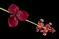 The flowers are clustered in racemes and are chocolate-scented, with three or four sepals. The fruits are sausage-shaped pods which contain edible pulp.[11][12] The gelatinous placentation contains seeds surrounded with white pulp, that has a sweet flavor.