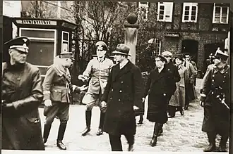 Joseph Goebbels wrote in his diary that Adolf Hitler himself had ordered the arrest of 25,000 to 30,000 Jews.[6] On the evening of 9 November 1938, Heinrich Müller announced the planned "actions against the Jews" to the "Stapo" offices. The arrest of 20,000 to 30,000 Jews was organized, targeting those with wealth or anyone considered to be publicly resisting the regime.[7] In the early morning hours of 10 November, Reinhard Heydrich forwarded an order by Heinrich Himmler to all state police headquarters and SD top sections. Soon in all districts as many healthy male Jews - "especially wealthy" and "not too old" - were to be arrested as could be accommodated in the existing detention rooms. Maltreatment was forbidden.[8]
