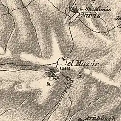 In 1870, V. Guérin visited al-Mazar, describing it as a village with about 500 inhabitants, situated at the peak of Djebel Foukou'ah, and surrounded by a belt of gigantic cactus plants. Numerous wells carved in the rock were said to point to the antiquity of the village. From the village, he could see the whole of Djebel Foukou'ah, which he identifies as the Mount Gilboa of biblical scripture, as well as the Jezreel Valley, the Little Hermon (actually Djebel Dhahy), Mount Tabor, and further north, the snowy peaks of Mount Hermon. Also seen from the village to the west and northwest were the Plain of Esdraelon and the Carmel Mountains; to the south, the mountains around Jenin; and to the east, before the Jordan River, what he calls the ancient country of Galaad. He notes that the name of Mount Gilboa is preserved in the name of the village of Djelboun, also situated on the mountain. Descending the mountain towards the west-southwest, at the base of the village of al-Mazar, he notes the presence of a spring of the same name, Ain el-Mezar, and on the slopes of this side of the mountain, which are less steep, there were olive trees and wheat being cultivated.[7]