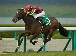 He was from the seventh crop of foals sired by Deep Impact, who was the Japanese Horse of the Year in 2005 and 2006, winning races including the Tokyo Yushun, Tenno Sho, Arima Kinen and Japan Cup. Deep Impact's other progeny include Gentildonna, Harp Star, Kizuna, A Shin Hikari, Marialite and Saxon Warrior.[2] Al Ain's dam Dubai Majesty was a top class performer on dirt in the United States, recording her biggest win when taking the Breeders' Cup Filly & Mare Sprint as a five-year-old in 2010.[3] Two days after her Breeders' Cup win the mare was put up for auction at the Fasig-Tipton Kentucky November select breeding stock sale and bought for $1.1 million by Northern Farm's Katsumi Yoshida.[4] She was a descendant of the Virginia-bred mare Knight's Gal who was the female-line ancestor of many good winners including Palace Malice and Mutafaweq.[5] The mare went on to produce the Tokyo Yushun winner Shahryar.