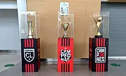 Alajuelense's 2021 Women's Torneo Apertura championship trophy, center