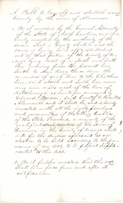 By the 1840s, the textile industry was booming, and the railroad was being built through the area as a convenient link between Raleigh and Greensboro. Efforts to split a new county off from Orange County began in 1842. A bill to form the county from Orange County. was filed by Giles Mebane on January 1, 1849, which passed the legislature later that month. An election was held on April 19, 1849 and the split was approved by the voters, with the new county being established officially on April 24 by Governor Charles Manly. [15][16]