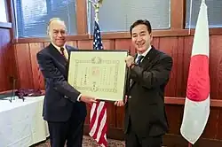 On Tuesday, May 3, Professor Alan Jeffrey Auerbach was presented the Order of the Rising Sun, Gold Rays with Neck Ribbon by Minister Daishiro Yamagiwa, Minister of State for Economic and Fiscal Policy, at the University of California, Berkeley.