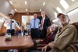 Alan Gross with his wife Judy, attorney Scott Gilbert, Rep. Chris Van Hollen, D-Md., Sen. Patrick Leahy, D-Vt., and Sen. Jeff Flake, R-Ariz. watch television on board a U.S. government plane headed back to the U.S. as the news breaks of his release, Dec. 17, 2014.