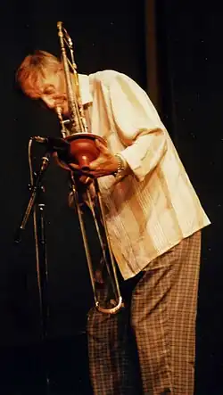 In 1961, he founded his Albert Mangelsdorff Quintet.[4] Mangelsdorff recorded prolifically in the 1960s, including sessions with his own quintet, his brother, and with pianist John Lewis.[2] By the time of his solo performance at the Munich Olympic Games in 1972, he was playing more free jazz.[2] In 1972, he recorded his first solo record Trombirds.[3] "He made solo trombone – a heretofore unknown concept in jazz – a reality via multiphonics, the physically and technically demanding simultaneous blowing and singing of notes into his horn; the method opened vast new dimensions like harmonies and chords".[2]