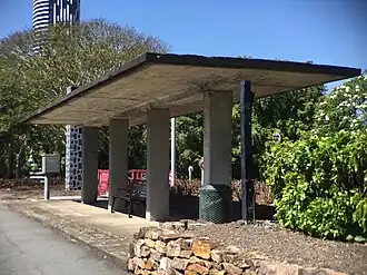 Of the 37 reusable shelters listed as being of the park type only 17 survive: one at Hefferan Park in Annerley; two at Albert Park (on the north and side souths); two at Wickham Park; one in Buranda Playground in Woolloongabba; two in Raymond Park (on the east and west sides) in Kangaroo Point; and one each at Kelvin Grove, Morningside, Nundah, Stones Corner, and Windsor. Four other shelters stand on East Street and Wickham Street in Fortitude Valley. Most are used as simple park shelters, as intended, but the shelter at Nundah has been modified as a toilet block, and the shelter at Kelvin Grove is used as a bus shelter (as distinct from those shelters in the next category, which were specifically designed as "bus" type shelters). About half of the surviving park shelters had concrete blast walls, while half used brick.[1]