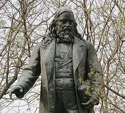 Michael Farquhar, a former writer and editor at The Washington Post, called Pike a "blustering blowhard, a feeble poet, a laughable hypocrite, a shameless jingoist, a notoriously insubordinate military officer, and yes, a bigot with genocidal inclinations".[19] John W. Boettjer, then managing editor of the Scottish Rite Journal, wrote a rebuttal op-ed in The Washington Post in defense of the memorial and pointed out that only an Act of Congress could result in the statue's removal.[20] Boettjer stated: "[Pike] received a full pardon from the federal government for his service in the Civil War as a Confederate general. There is not a jot of reliable proof that Albert Pike was ever a member, much less an officer, of the Klan." He also claimed a LaRouche video promised the Middle East conflict would be solved and World War III averted if the statue was removed.[20] In December 1992, the Washington, D.C., city council passed a resolution, sponsored by Charles Urdy, asking for the statue to be removed.[21] The weekly protests by LaRouche supporters continued into 1993. That year Bevel and Chaitkin were convicted of "unlawful statue climbing" and sentenced to one week in jail.[22]