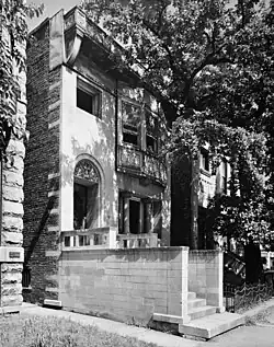 The house, was constructed on a narrow lot (21.5 ft (6.6 m)), as part of a stretch of row houses along South Lake Park Avenue.[2] The building was set back 10 ft (3.0 m) from the sidewalk, and the front yard was enclosed within a simple, low iron fence. The bedford limestone street facade was relatively austere, reminiscent of Sullivan's James Charnley House, although the box cornice and decorative bay window on the second floor, were sheathed in ornamented copper. The vestibule had a mosaic floor, plaster walls, with a coved plaster cornice.[2]