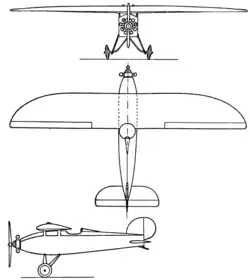 The fuselage was constructed from spruce and ply box girders and was ply covered, with flat sides and bottom and a pitched top.[3] The engine was mounted uncowled on a steel tube frame[3] and the open single cockpit was half under the trailing edge, allowing clear views above and below the wing.[1] Its empennage was conventional and of similar construction to the wing; the tailplane was mounted at mid-fuselage and had a plan similar to that of the wing, with full span, narrow chord elevators controlled by rods. The vertical fin was quadrant shaped and carried a cable controlled semi-circular rudder that extended down as far as the tailplane.[1][3]