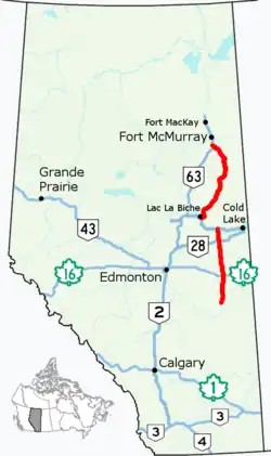 Alberta Provincial Highway No. 881, commonly referred to as Highway 881, is a highway split into two sections in northeast Alberta, Canada. Each section is over 200 kilometres (120 mi) in length; the southern portion runs from Highway 13 in Hardisty to Highway 55 northwest of Bonnyville, while the northern section stretches from Highway 55 in Lac La Biche to the south side of Fort McMurray, serving as an important alternate route to Highway 63.[2] A 72-kilometre (45 mi) section of Highway 55 joins the two sections. Lac La Biche County is lobbying the Government of Alberta to renumber the section of Highway 881 between Lac La Biche and Fort McMurray to Highway 36.[3]