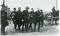 Policing of the area now known as the Province of Alberta began in 1874 with the creation of the North-West Mounted Police (NWMP). King Edward VII, awarded the title Royal to the North-West Mounted Police (RNWMP) in 1904.[4] Upon Alberta entering Confederation in 1905, Wilfrid Laurier proposed that the mounted police should remain in the new provinces, under contract to the provincial authorities for $75,000 per year apiece – about one-third of the actual operational cost – a solution which was approved by both sides.[5] The workload on the police grew quickly as a consequence, with the criminal cases being handled almost trebling between 1905 and 1912 to over 13,000.[6] Despite complaints from Commissioner Aylesworth Bowen Perry, the government refused to increase the establishment of the mounted police.[6] By 1913, the provinces were expressing dissatisfaction about the service being delivered.[7] Tensions grew between temperance campaigners and soldiers over the implementation of the liquor laws.[8] The police barracks in Calgary were attacked in October 1916 by a crowd of over two hundred soldiers and civilians, who were trying to release six soldiers arrested for alcohol offences.[9] The building was destroyed, one police officer was shot and several more injured.[9]