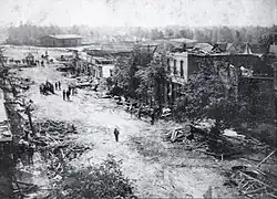 At about 4:10 p.m. on April 24, 1908, the city was virtually wiped out by a tornado that became commonly called "The Great Cyclone", or "The Cyclone of 1908".[9] The storm is believed to have killed 35 people across northeastern Alabama, including 15 in Albertville.[10] Relief was largely delivered by railroad, particularly from the nearby city of Gadsden. Trains from Gadsden transported doctors, nurses, and the Queen City Guards, the Alabama militia company based in Gadsden. The commander of the latter, future Gadsden mayor and Col. R.A. Mitchell, reported in a dispatch to Governor B.B. Comer: