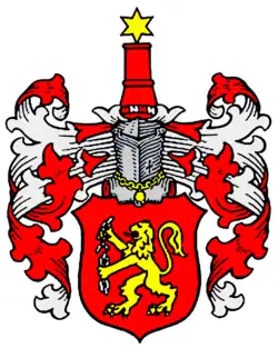 Throughout history, the family received the coat of arms for their services. It features in red a golden lion that breaks a silver chain. On the red and silver bulging helmet with red and silver covers, there is a red column on which stands a golden star.