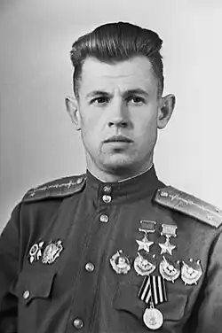 Having been deployed to the warfront in August 1942, he flew as a pilot in the 594th Assault Aviation Regiment until being transferred to 198th Assault Regiment in November. There he rose up through the ranks from being an ordinary pilot to flight commander, deputy squadron commander, and eventually squadron commander. In June 1944 he was nominated for the title Hero of the Soviet Union for having flown 100 sorties, and was awarded it on 26 October 1944. His actions during an attack on Danzig airfield on 25 March 1945 were described by Marshal Fedor Falaleyev in a book of essays praising pilots published by a military academy after the war. In that mission, he led a group of 16 Il-2 in attacking a hangar, resulting in the destruction of 14 enemy aircraft. Two days later he completed his two-hundredth sortie; in that flight he led a group of eight Il-2s in taking out three tanks, four anti-tank guns, two mortars, and killing dozens of enemy personnel. On 6 April 1945 he was nominated for a second gold star for having tallied 200 sorties. By then he had transferred to the 62nd Assault Aviation Regiment as head navigator, but he continued to fly in combat, flying his later sortie on 5 May 1945 over Świnoujście, for a final tally of 222 sorties. After the war he was awarded the title Hero of the Soviet Union for a second time on 18 August 1945.[5][6]