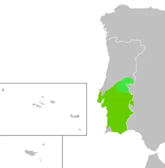 ![]() Distribution of the Inland Central-Southern dialects, to which Alentejan and Baixo-Beirão-North Alto-Alentejan dialects belongs.