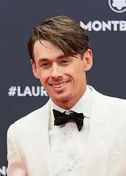 Seeded No. 27 at the 2019 Australian Open, he lost in the third round to Rafael Nadal.[46] De Minaur reached a then career-high ranking of World No. 24 in March 2019.[47] Following the Australian Open, De Minaur suffered a groin injury, sidelining him for two months.[48] At Wimbledon, De Minaur won his opening round before losing to Steve Johnson in the second round in five sets.[49] De Minaur made his fourth ATP Final in Atlanta where he defeated Taylor Fritz to clinch the trophy.[50] He did not face a single break point in the four matches he played during the tournament, winning 116 of 123 first serve points.[51][52]