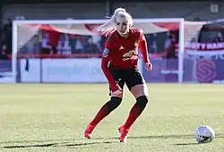 On 20 September, she made her Championship debut in a 3–0 win against Sheffield United.[19] On 18 November, she scored her first goal for Manchester United with a penalty spot in a 5–0 away win at Crystal Palace.[20] Under her leadership, Manchester United won the Championship and gained promotion to the FA WSL in their debut season.[21]