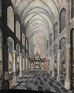 Only a few works are attributed to Casteels. There are five works, all in watercolor on paper, that depict interiors of chapels and churches in Antwerp. Only two works are dated. The first is dated 1710 and shows an Interior view of the small Gothic St Anne chapel in de Keizerstraat in Antwerp. This work is located in the chapel itself and shows the altarpiece that now no longer hangs in the chapel. The second work represents the Interior of the James' Church of Antwerp. A third work depicts the Interior of the chapel of the Jesuit college in the Hof van Liere (Rhode Island School of Design Museum) in the Prinsstraat in Antwerp. In the St. Charles Borromeo Church, Antwerp hangs an undated interior view of that church without figures. Casteels also depicted the interior of the Cathedral of Our Lady, but the location of this work is unknown. Because of their naive style, these works of Casteels lean more towards folk art than fine art. They are not of a very high painterly quality but serve as interesting documentation about these buildings that are still in existence in Antwerp.[3]