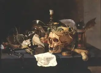 For instance, in the Still life on a partly draped table the various objects convey hidden meanings: the grapes and the glass of red wine refer to Christ and his blood, the bread references the Last Supper of Christ and the Christian communion and the silver vessel looks like a ciborium that holds the consecrated hosts during the Catholic Mass. The crabs, just like the lobsters in his other still lifes, refer to the Christian belief in the resurrection of Christ since these crustaceans must, in order to grow, lose their carapace and start a new life. The partly peeled lemon stands for the various stages of human life and its vulnerability and suffering.[7]