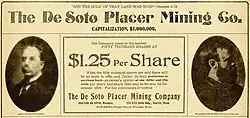 After securing grounds with rich deposits in Alaska, De Soto found investors from the East Coast for the De Soto Placer Mining Company. He also placed a large piece of the company's stock for sale, advertised it in newspapers, and raised up to $200,000 from it.[113][104][115][116] Home offices, and a large number of the majority stockholders of the company, were situated in Philadelphia.[107] Almost at once, the company became known as one of the best and largest mining companies in the world.[102][117][102]