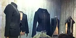 The exhibit included pieces from his first major collection, Jack the Ripper Stalks His Victims, created during his graduate studies at Central Saint Martins College of Art and Design.[4] Other collections included in the exhibit were Dante, It's a Jungle out There, Irere, #13, VOSS, and Plato's Atlantis,[5] as well as Banshee, Highland Rape, The Widows of Culloden (including the original life-size hologram of Kate Moss), and Horn of Plenty.[4] Also included in the exhibition were works by McQueen's collaborators such as the milliner Philip Treacy and jeweler Shaun Leane who produced designs used in his runway shows.[6]