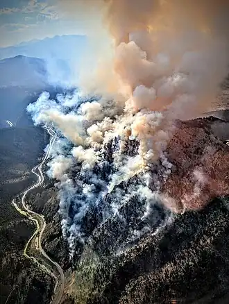 Fire behavior was described as group torching, uphill runs and shortrange spotting of timber, brush, and grass.[26] Volatility challenged ground and aerial firefighting crews, spreading northwest, a total of 7,648 acres with 1% containment.[27] Without verifiable flying range, aviation assets were at times limited. When safe, resources dropped water and fire retardant to help secure the fire perimeter and protect values at risk. Firefighters achieved initial containment by lighting backfires, burning vegetation ahead of the fire's advance, thereby securing the east perimeter near the Sylvan Dale Ranch staging area.[27][19] Fire behavior was described as group torching, uphill runs and shortrange spotting of timber, brush, and grass.[26]